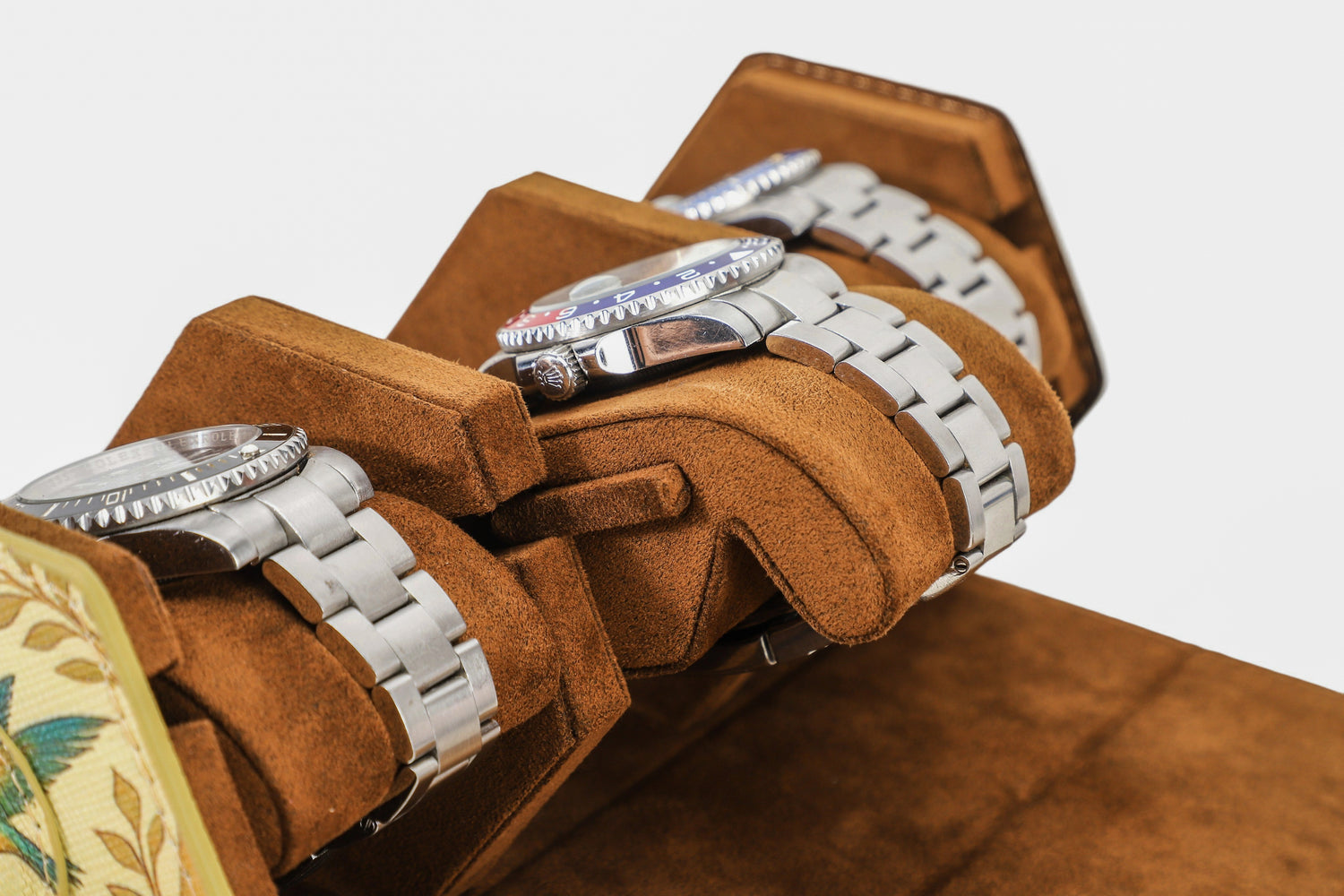 Our watch rolls are crafted with imported Italian Alcantara® and trimmed with sustainable vegan leather and gold accents, featuring sliding, compressible cushions and a concealed AirTag slot for seamless security.