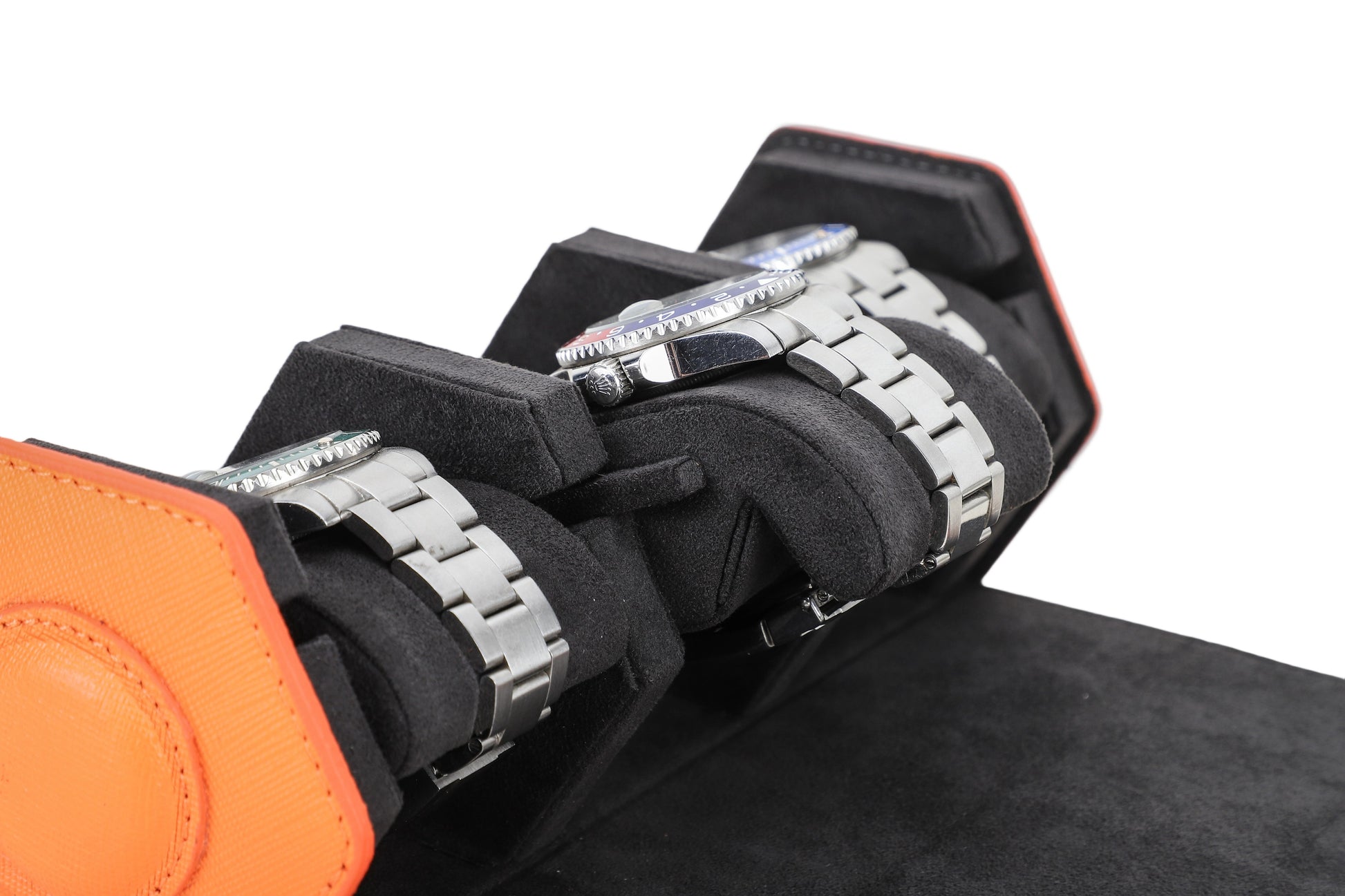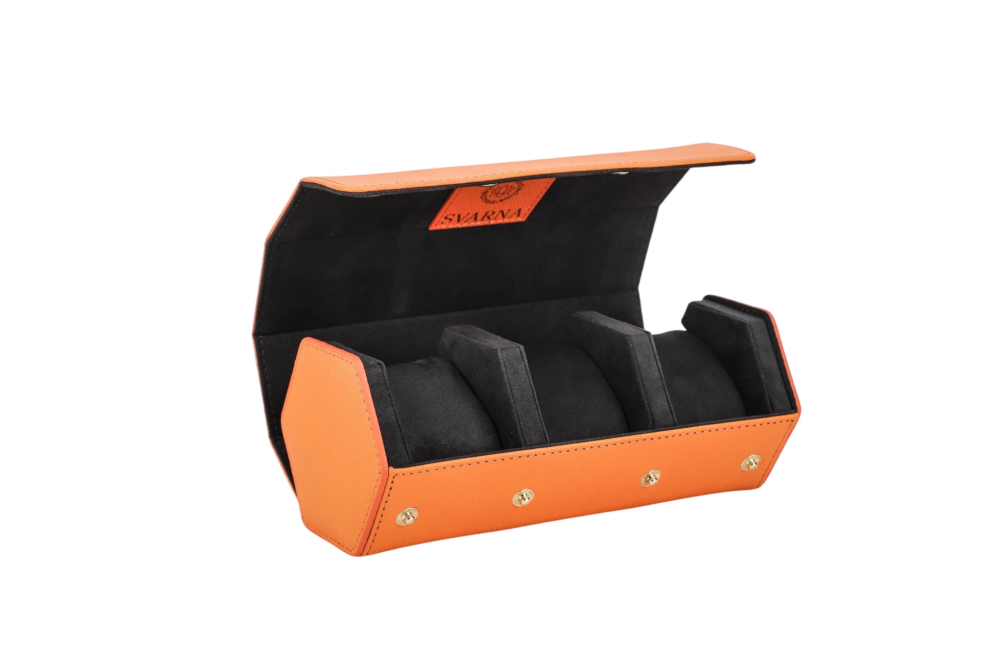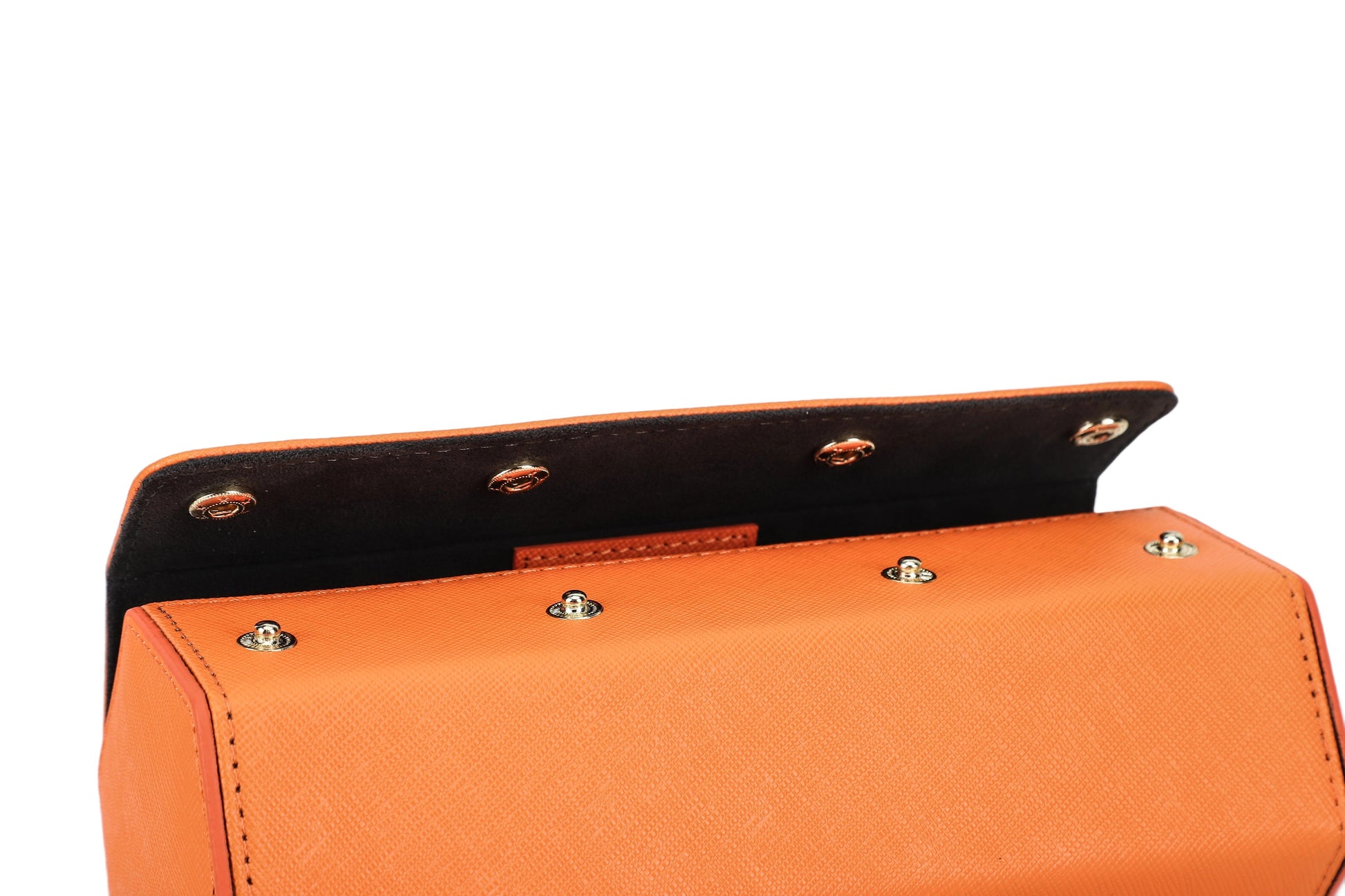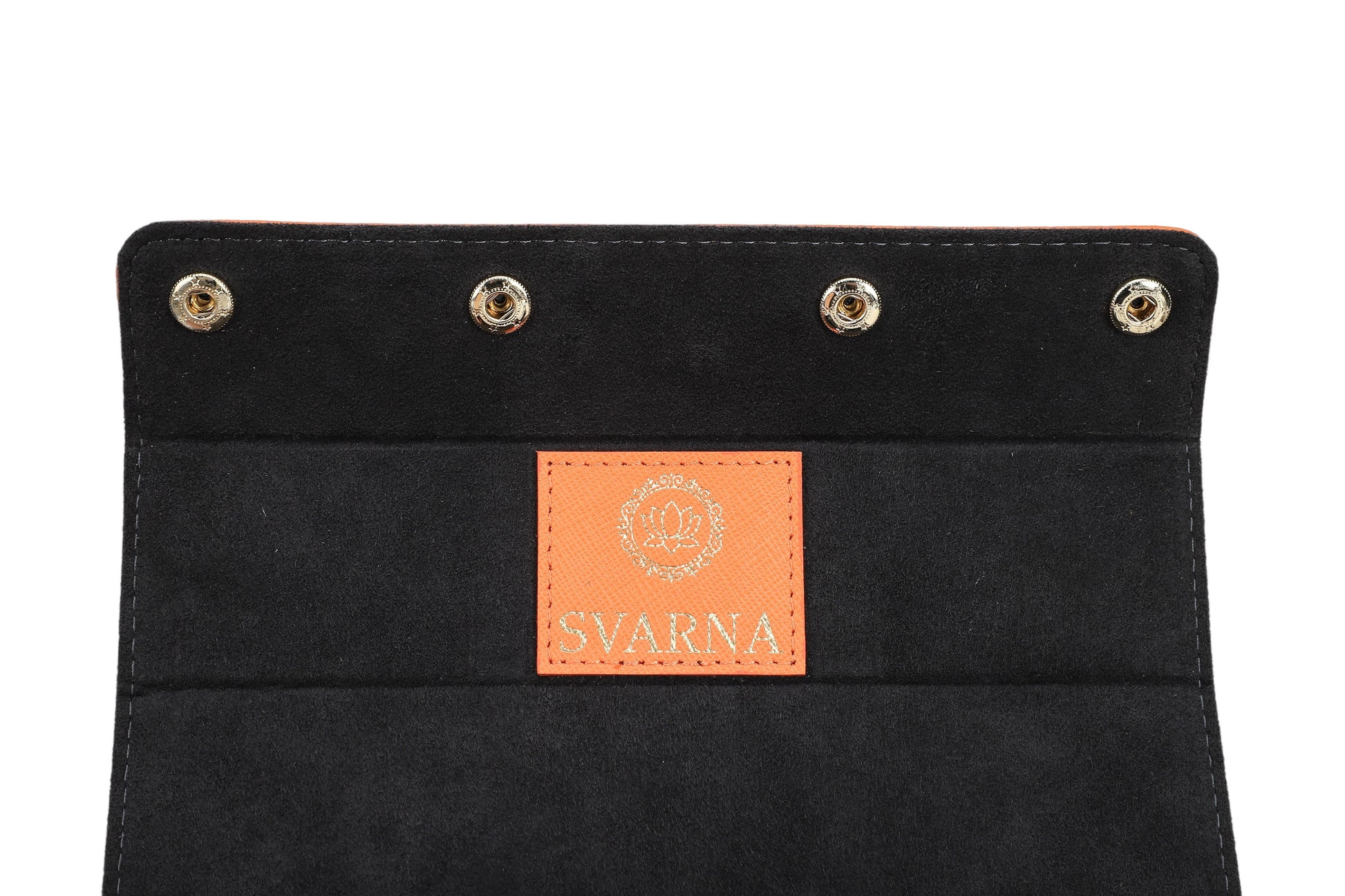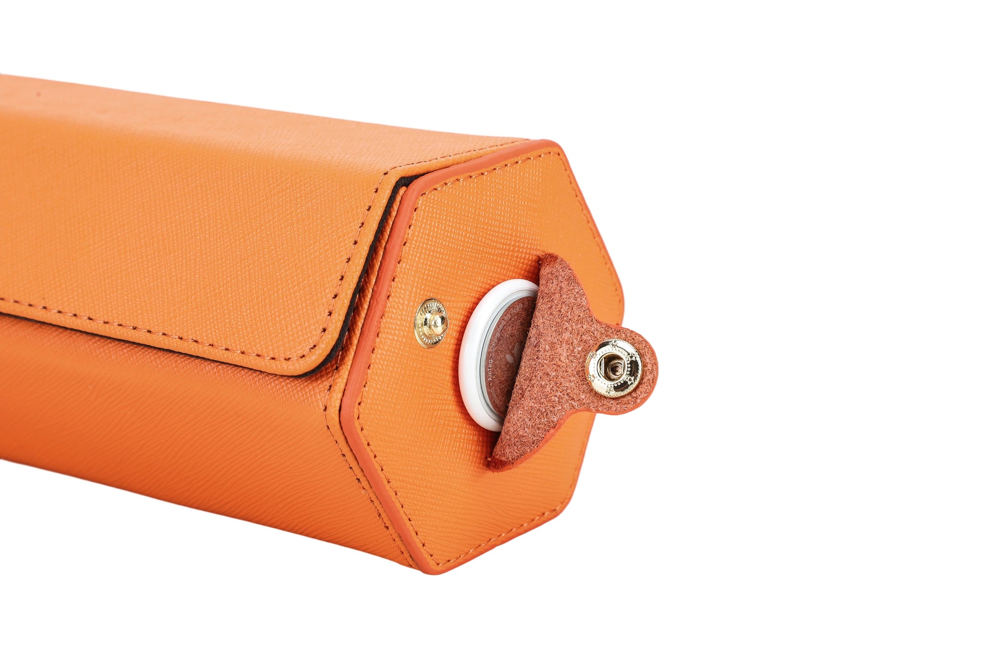 Bold and luminous, Kesari Orange draws from sacred, ancient robes and spice markets. Crafted with imported dark grey Italian Alcantara® and trimmed with sustainable vegan leather and gold accents, it features sliding, compressible cushions and a concealed AirTag slot for seamless security. Bright, commanding - unmistakably yours.