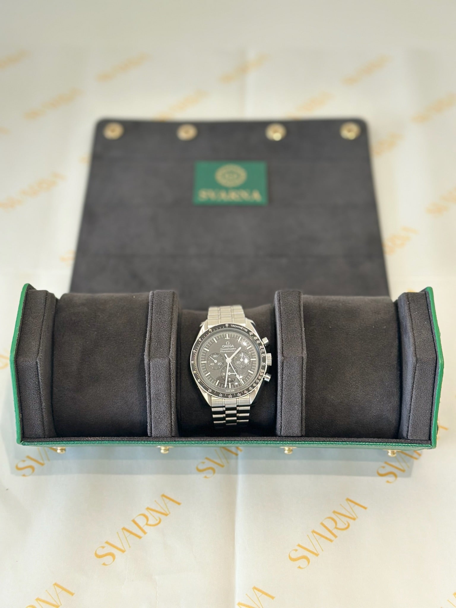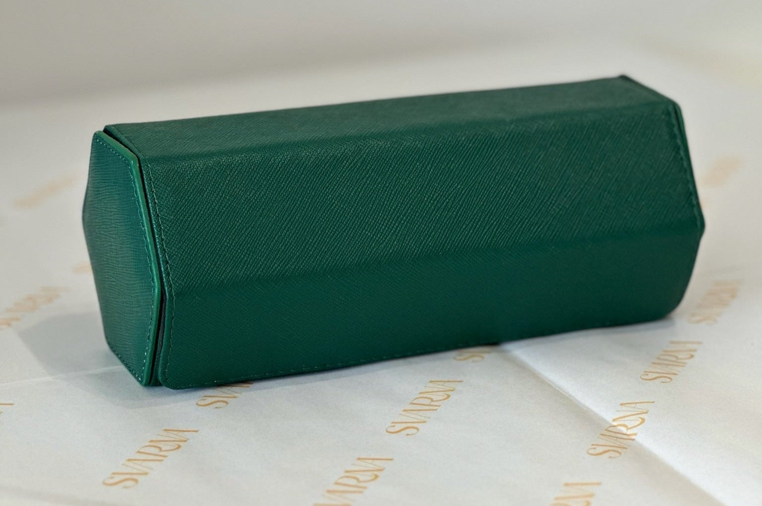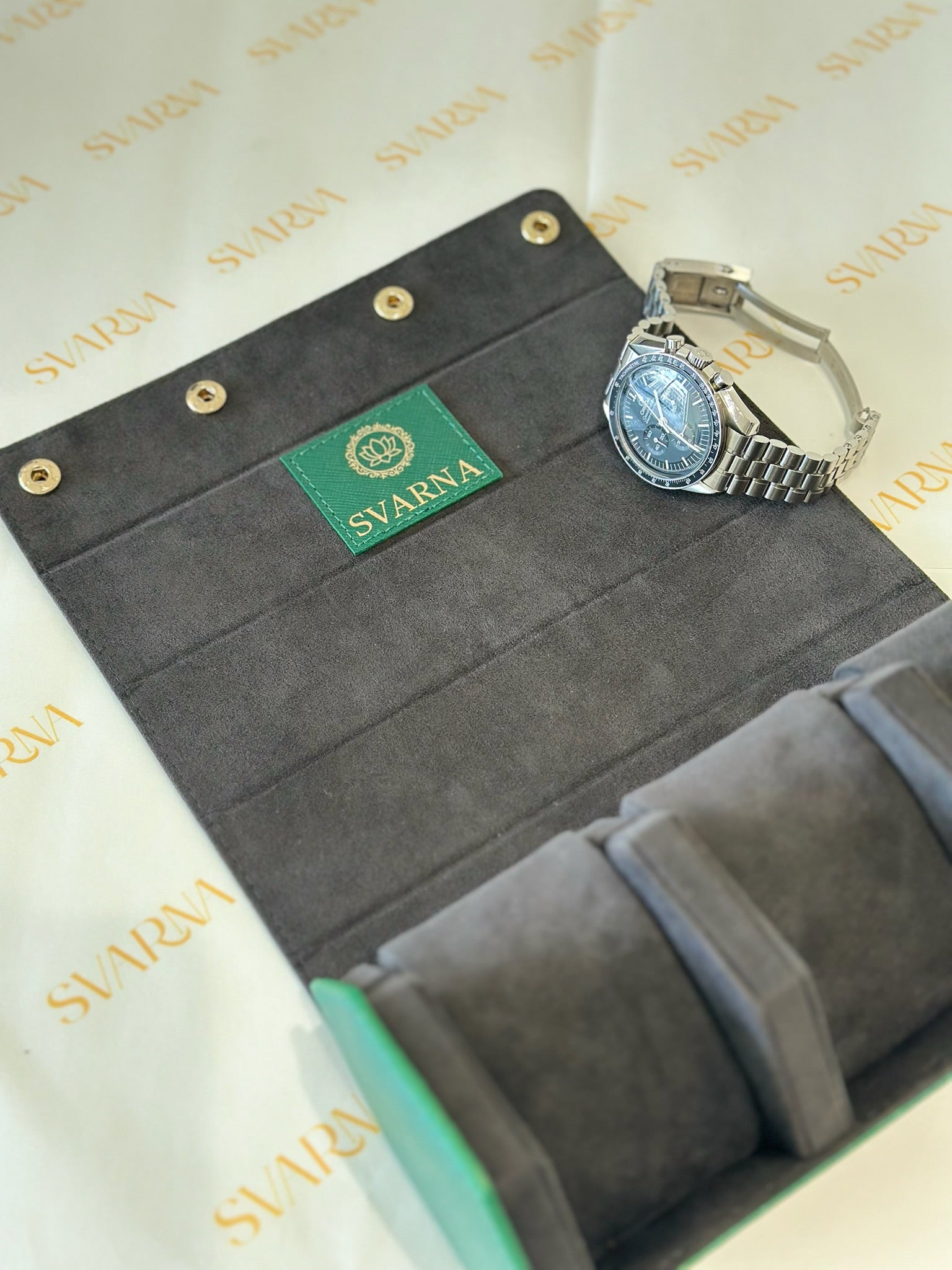 Unmistakably distinct, Racing Green calls to mind the heritage of British motorsport. Crafted with dark grey imported Italian Alcantara® and trimmed with sustainable vegan leather and gold accents, it features sliding, compressible cushions and a concealed AirTag slot for seamless security. Bold and mysterious.